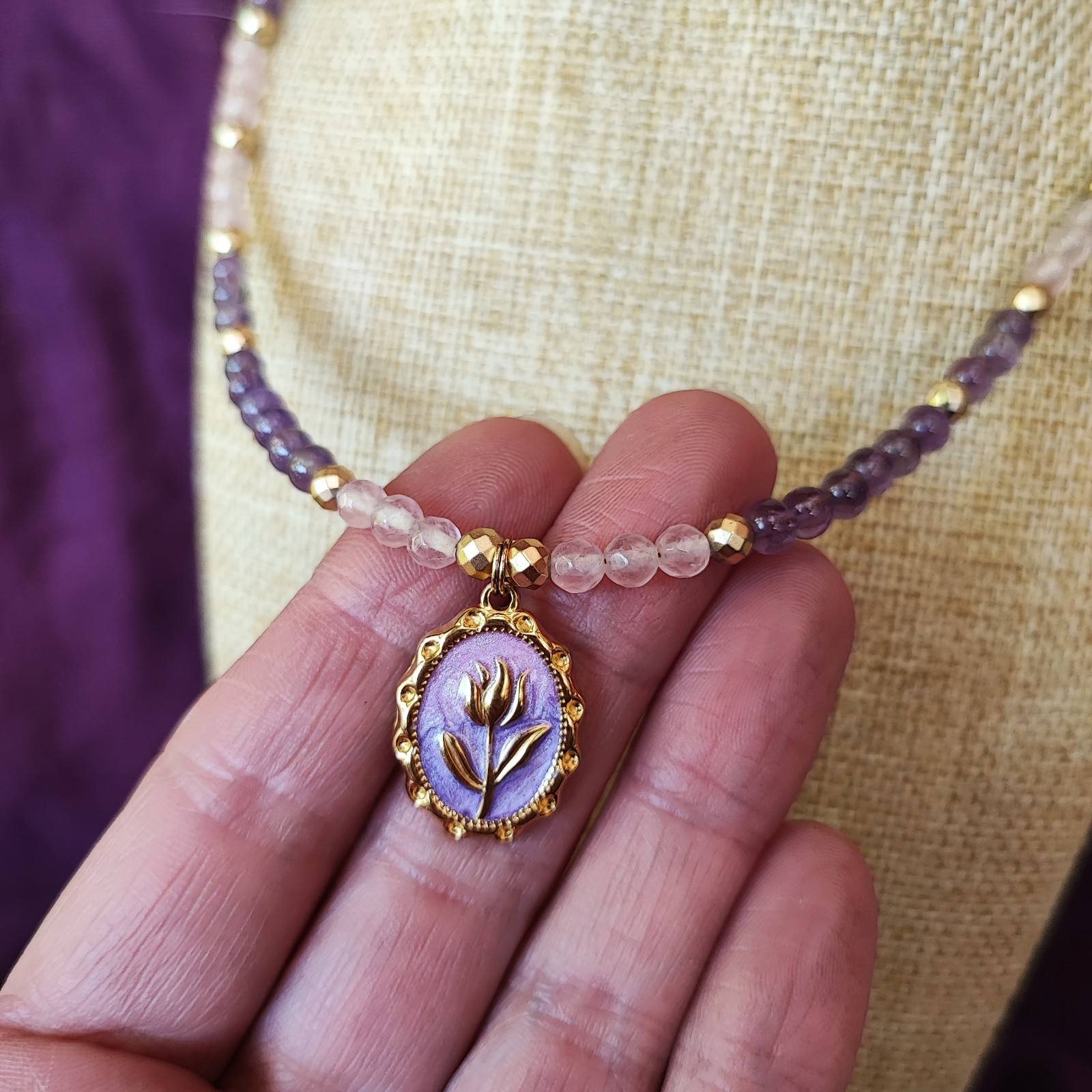 Collar corto ajustable de Cuarzo rosa, Amatistas y Hematitas doradas facetadas (4 mm), con colgante tulipan, en acero quirúrgico dorado.