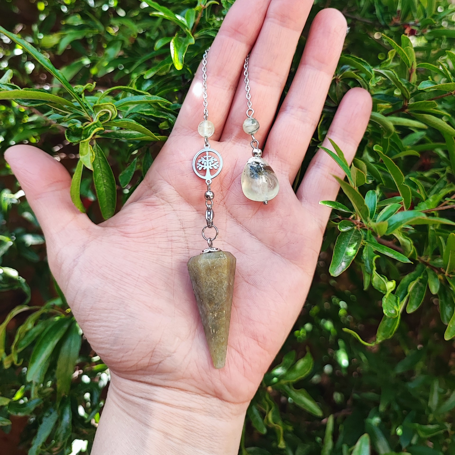 Péndulo único, con maravillosa punta de Vesuvianita (Idocrasa 42 x 20 mm) y Prehnita (esferas 6 mm y piezas 18 x 10 mm), con colgante árbol En acero quirúrgico resistente e hipoalergénico, largo total 21 cm. Punta desmontable para usar como colgante.
