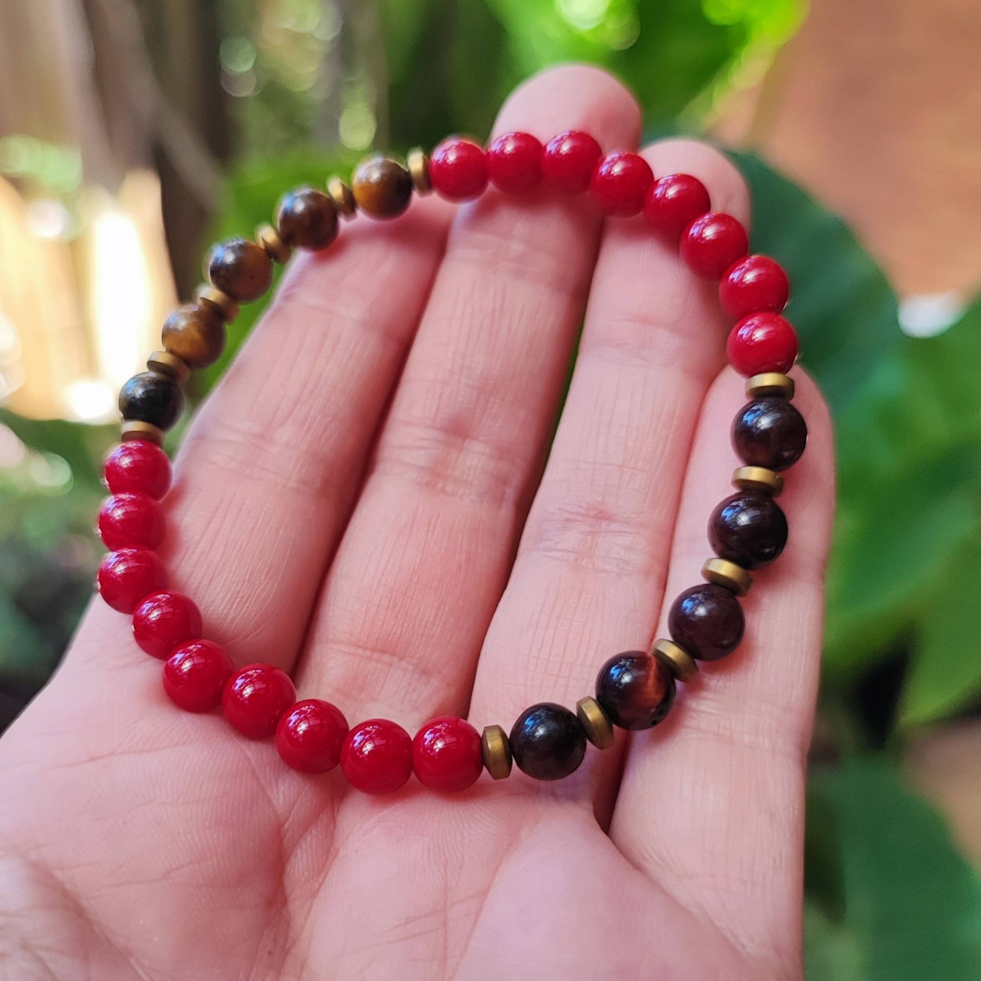 Pulsera de Jade rojo, Ojo de Buey y Ojo de tigre (6mm), detalles de Hematita dorada mate, 18,5 cm de largo.